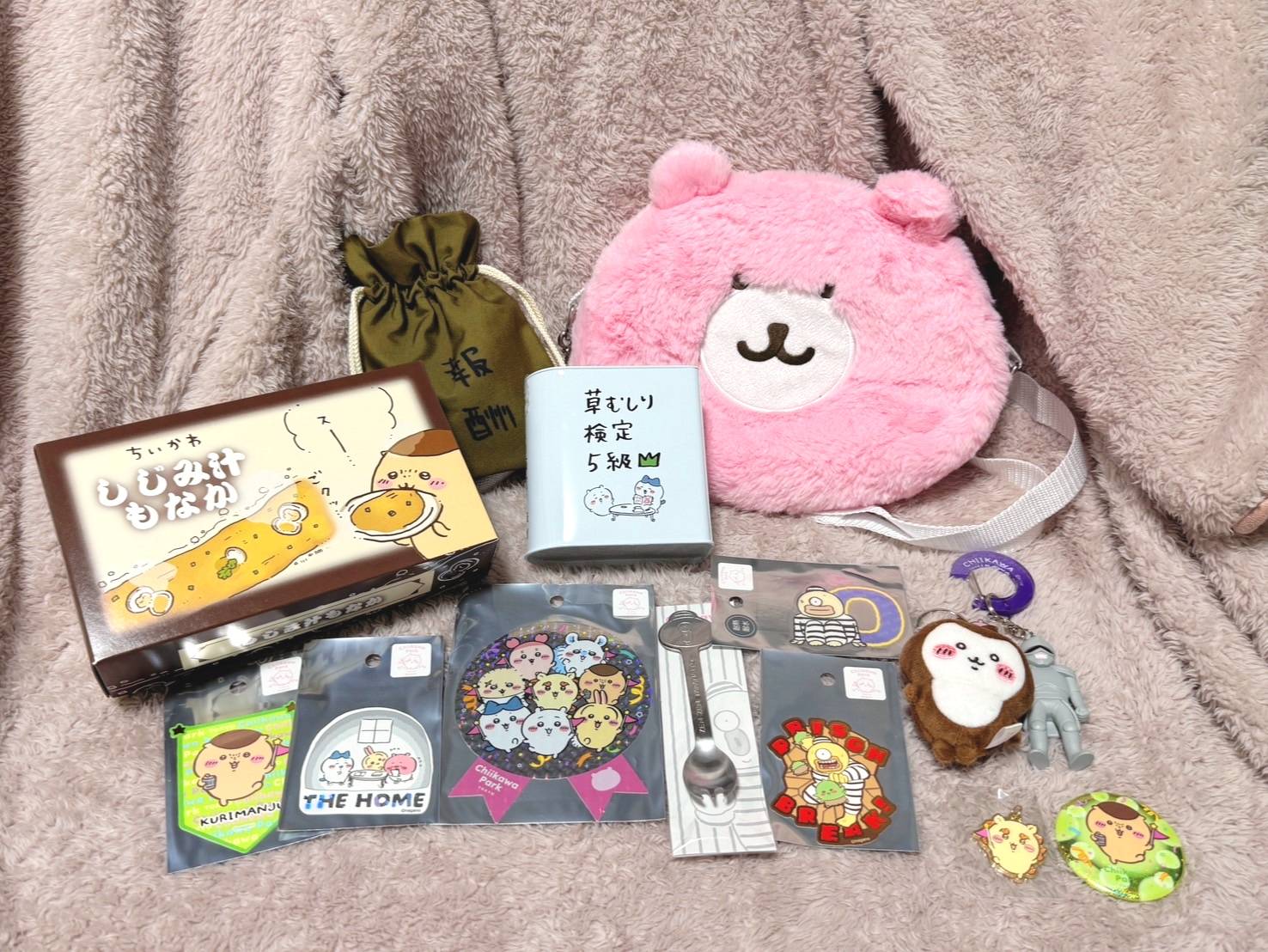 ここで、ピンク色の “ちいかわのくまさんポシェット”を買いました。このポシェットは、鎧さんとちいかわとおそろい! 大きさも素晴らしい。ふわふわで気持ちいい。かわいすぎる。