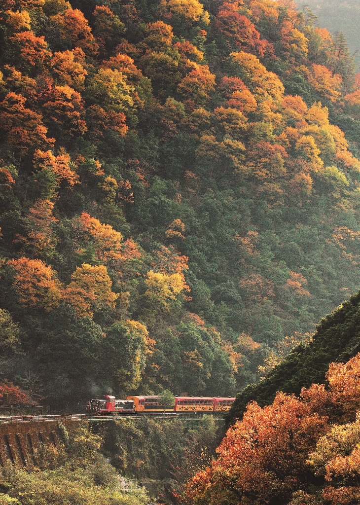 約2,000本もの木々が秋化粧した渓谷を、トロッコ列車に揺られながら見る景観は贅沢の極みです!