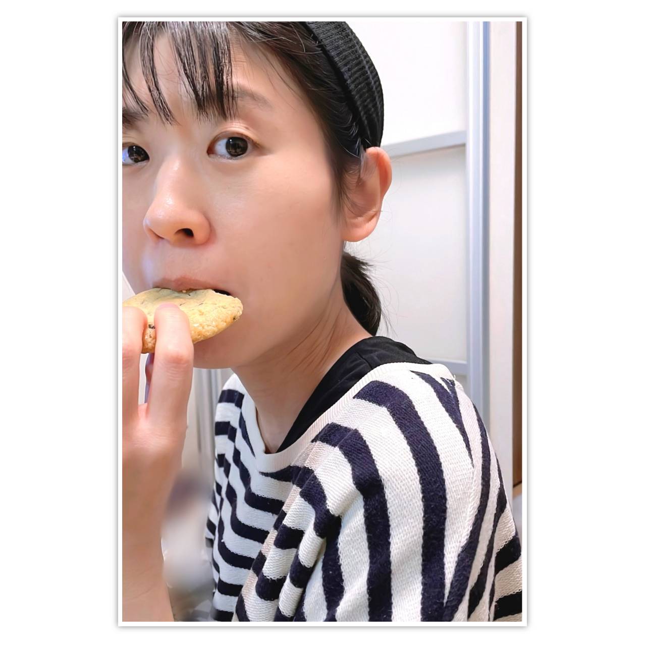 香港のクッキーを頬張る酒寄さん。