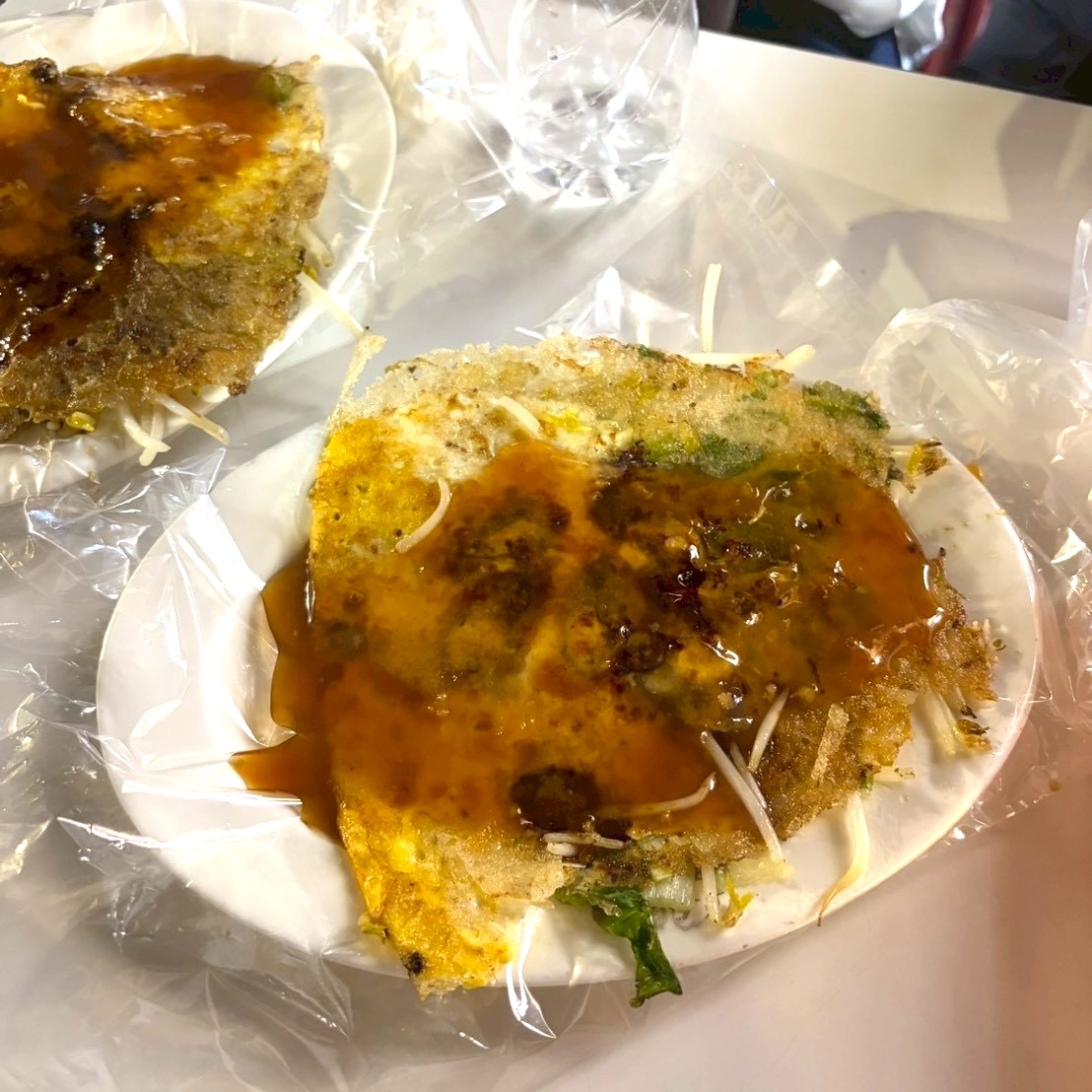 台湾の屋台で行列ができる人気メニューといえば、牡蠣お好み焼き。小粒の牡蠣がゴロゴロと入っていて、卵を混ぜた生地をカリフワッと焼き上げたものです。上から甘塩っぱいあんかけっぽいタレがかかっていて、日本人なら誰もが好きな味付けでした! 牡蠣ひとつひとつは結構小粒ですが、ふんだんに入っていることもあり、満足感がスゴい♡