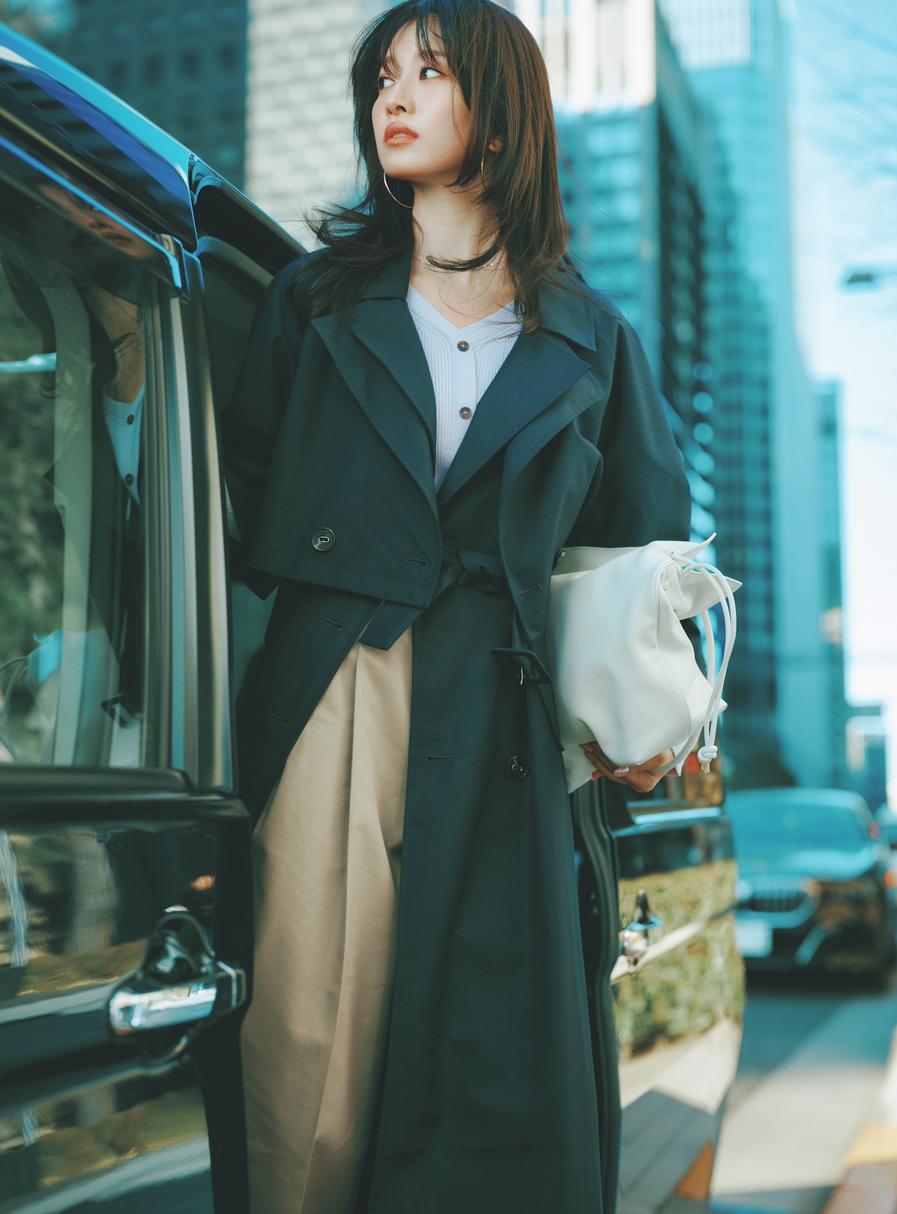 3WAYトレンチを今日はジレとして。オフィスにも映えるきちんと感を保ちながら、ロング&リーンなシルエットでスタイルアップも叶う! ウエストベルトはマーベルト部分を折り返してはくこともでき、こなれたオフィススタイルに。
