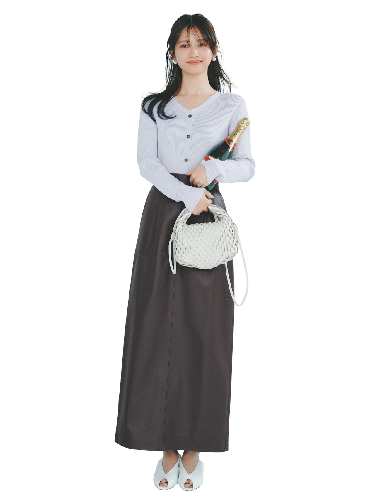 ベーシックカラー派だけれど、友達のお祝いの席は華やかさで盛り上げたい! 胸元が開きすぎないVネックニットは、1枚で着ても顔周りがぼやけず、すっきり見え♪ 本革レザースカートのしっとりとした質感が、コーデ全体をぐっと格上げしてくれる。