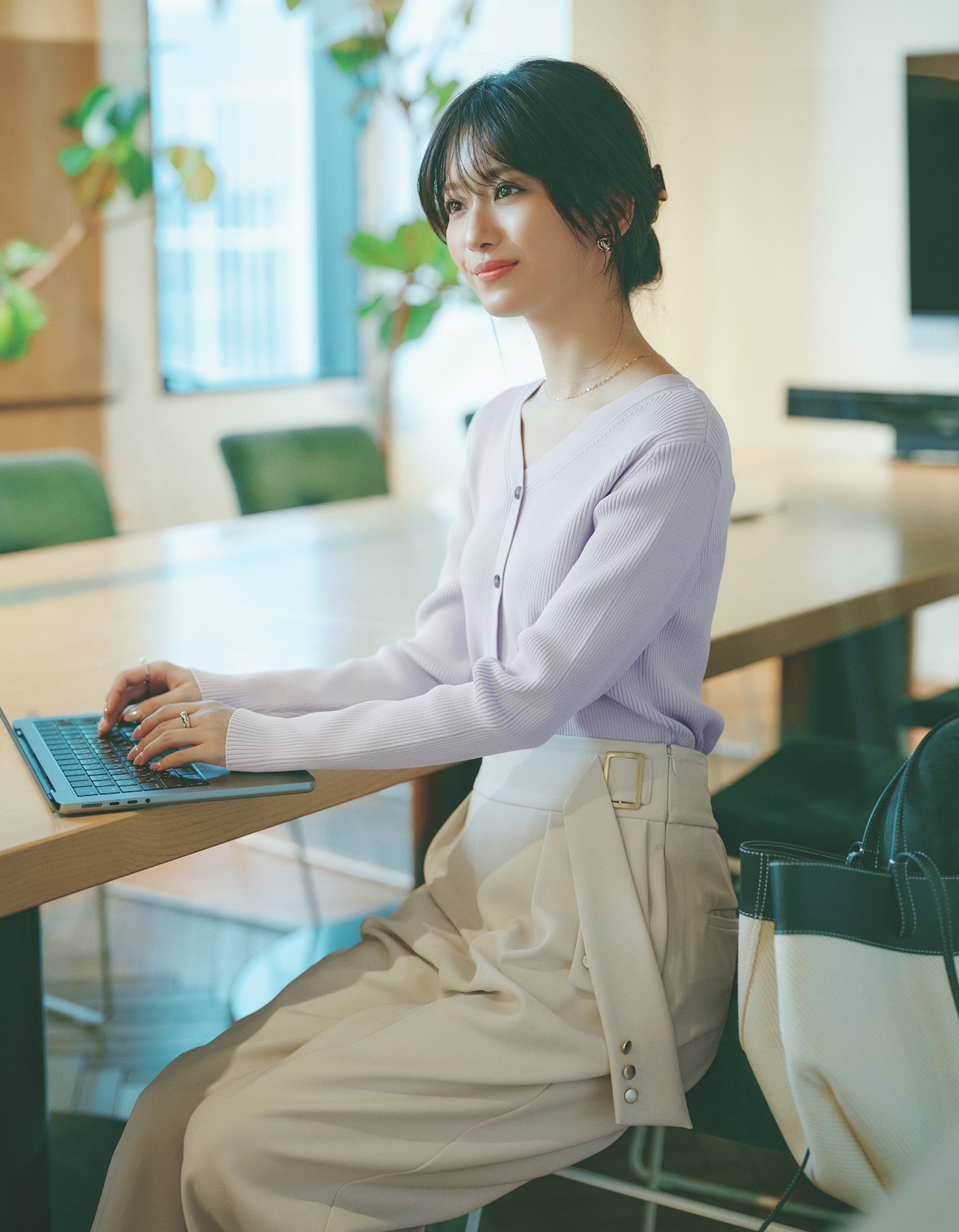 一緒に働いてくれる部下やインターン生との1 on 1は何よりも大事な時間! ラベンダーカラーのトップスで話しやすい雰囲気作りを意識。