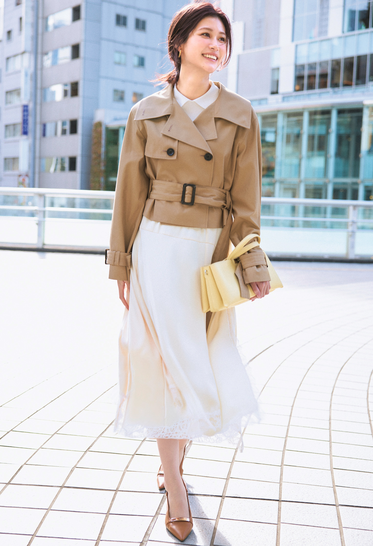 柔らかく滑らかなサテン素材にレースを合わせたセンシュアルなスカートは、かっちりしたトレンチや襟付きニットで緩急をつけてオフィス映えする着こなしに! ブラウン〜ホワイトできれいめにまとめつつ、ビタミンカラーのバッグで春らしさも添えて。