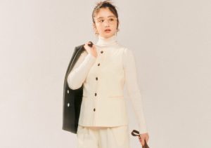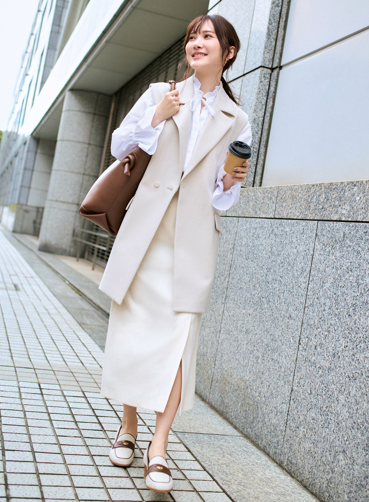 かっちり感のあるジレコーデは、甘ブラウスを仕込んで微糖に。白×ベージュのまろやか配色も、優しげで親しみやすい印象に見せてくれる♡