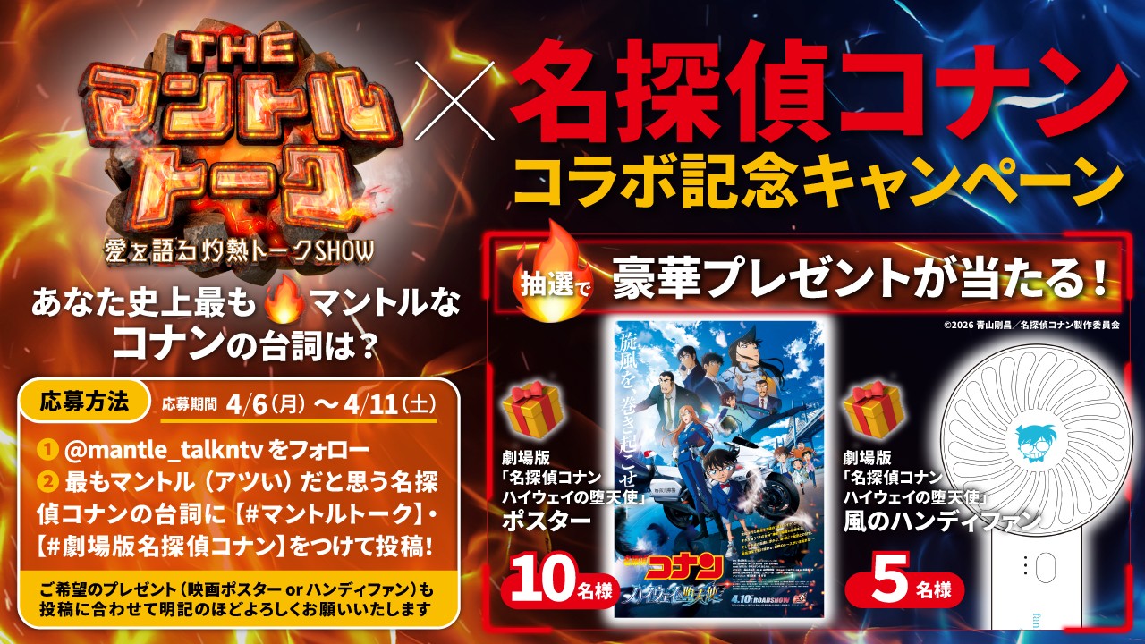 番組公式Xでは、プレゼントキャンペーンを4月6日~11日の間で実施。アカウントをフォローし、最も「マントル(アツい)」と思うコナンのセリフにハッシュタグ【#マントルトーク】・【#劇場版名探偵コナン】をつけて投稿すると抽選で、劇場版『名探偵コナン ハイウェイの堕天使』ポスター(10名)や『名探偵コナン ハイウェイの堕天使』風のハンディファン(5名)が当たります!