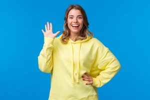 • Cheerful,Friendly,Outgoing,Blond,Girl,Waving,Hand,,Informal,Greeting,Concept,
