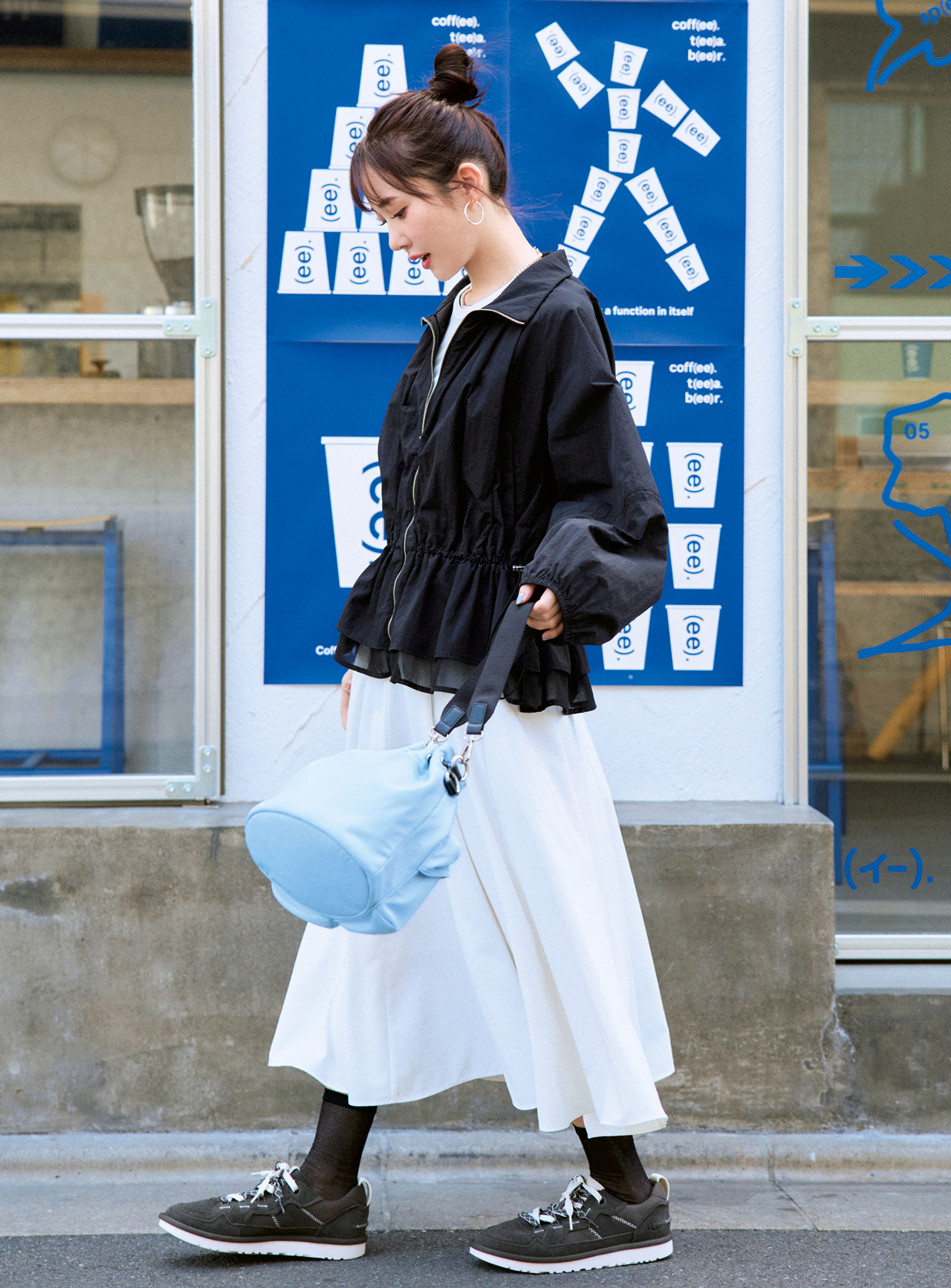 甘さのある白スカートは、スポーティなアイテムでラフに振ると肩の力が抜けた印象に。 合わせるブルゾンは裾が絞れたりシルエットにメリハリがあるなど、ミニマルな上半身が作れるものをチョイス!