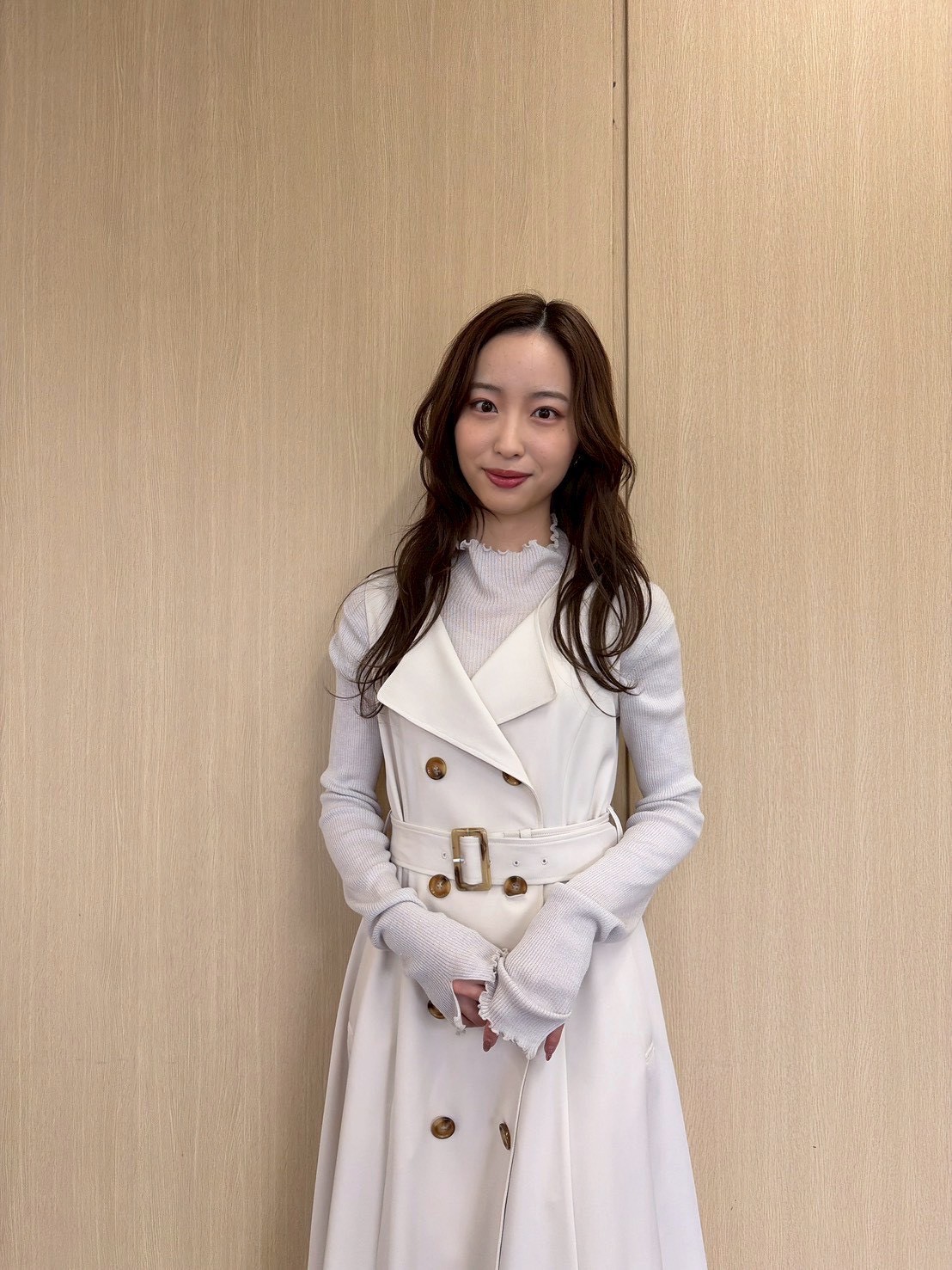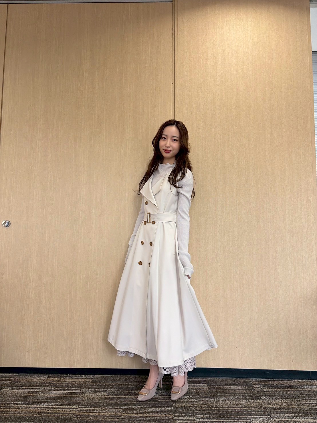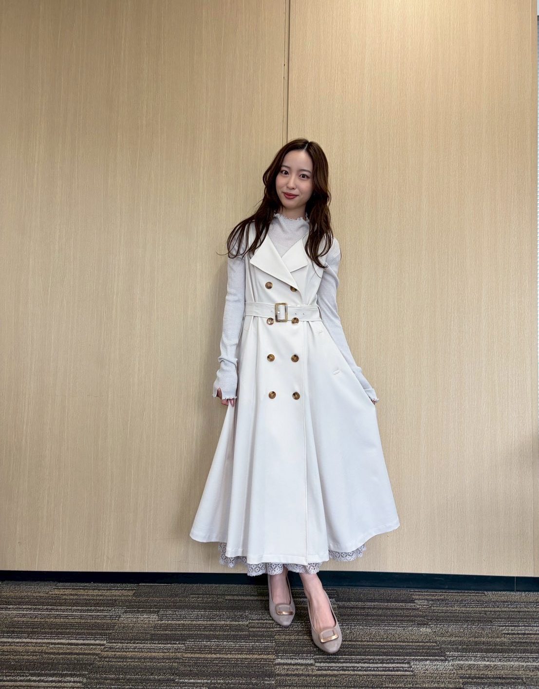 前を閉じて、ワンピース風スタイルの出来上がり【林さんのエクリュトレンチコート着用画像5枚】