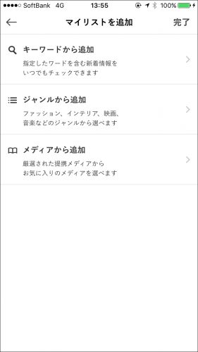 石原 この「マイリスト」は、キーワードやジャンル、配信されている提携メディアから自分の好きなものを選ぶことで、好きな情報だけを常に受け取ることができるという機能なんです。先ほどの画面の右上「追加」を押すとこの画面になります。たとえば「キーワード」を追加すると、「antenna*」に配信されているコンテンツから、そのキーワードが含まれているコンテンツを探してくれます。