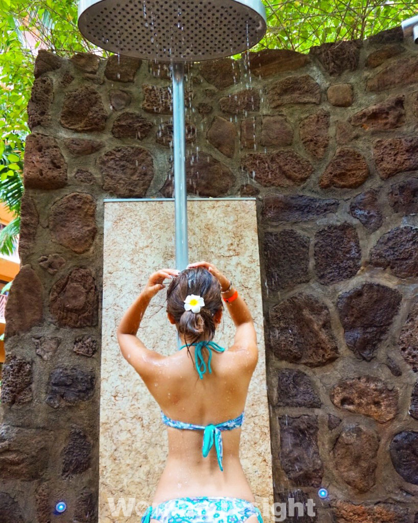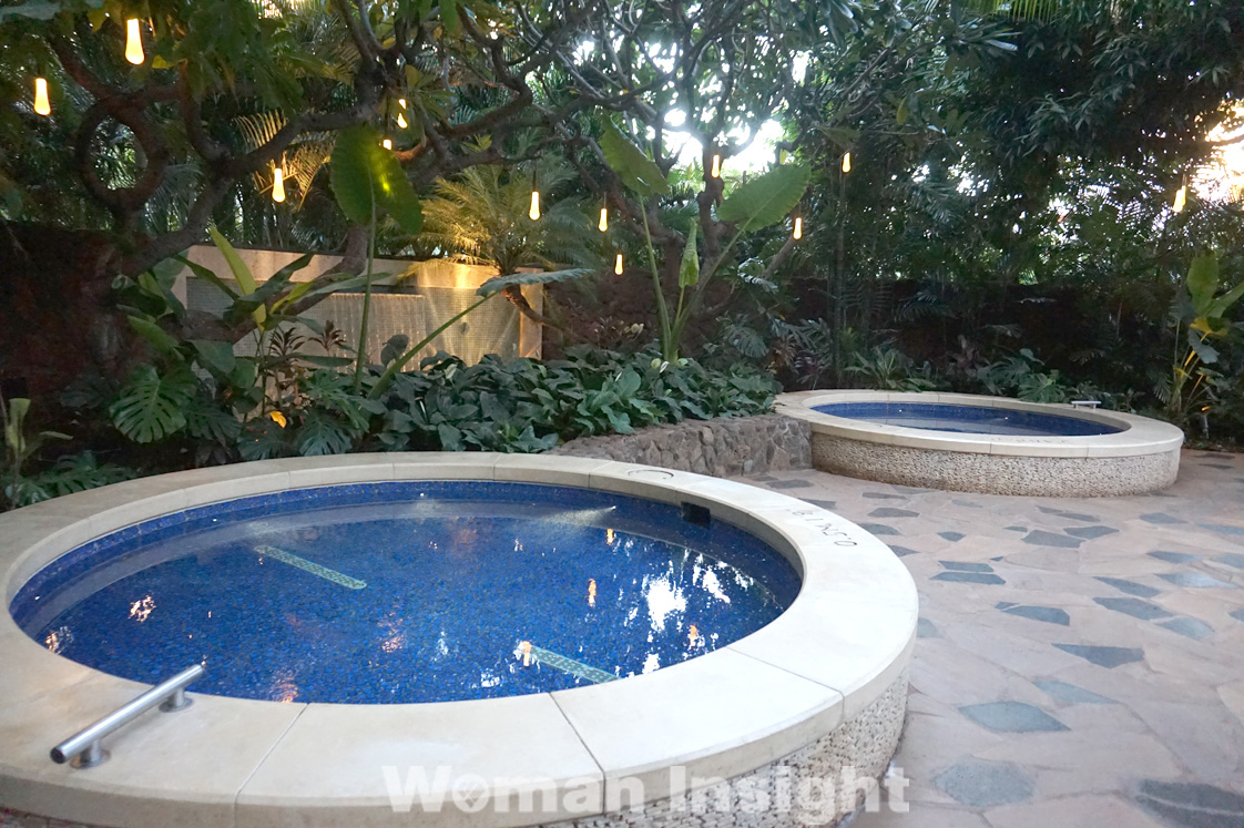 6つのレインシャワーのほか、ジャグジー、ソーキング・バスなど、さまざまなホットバスが並んでいます。水着を着用して入るので、カップルで過ごすこともできて、なんともリラックスできる空間に。