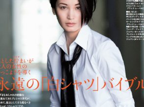 [モデル/左]流行の襟抜きシャツを試してみたい人は、お手頃プライスで手に入るメンズシャツを賢く、おしゃれに! 第2~3ボタンまでラフに開け、肩を背中側に引っ張って落とすように着てみると、女性らしい着こなしに。