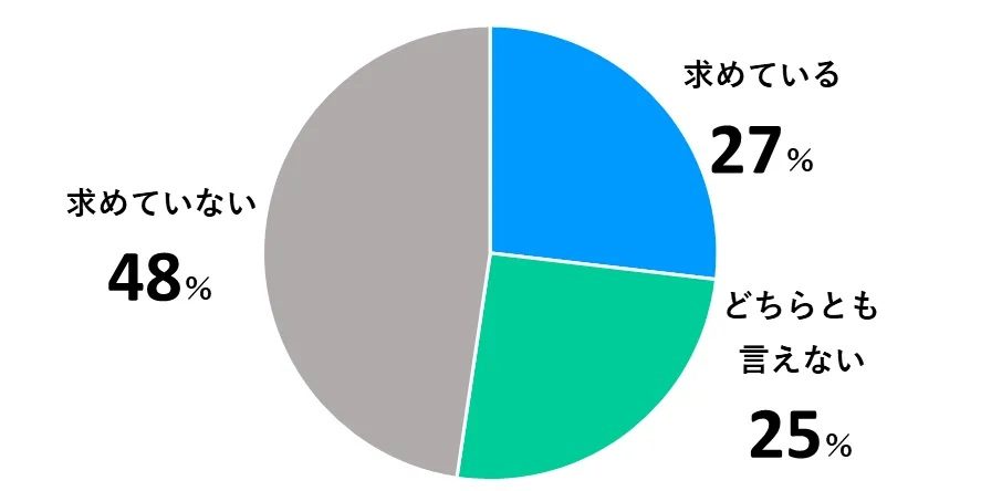「現在、職場で恋人・パートナーとの出会いを求めていますか?」という質問に対して、「求めている」と回答した人は約4人に1人、「求めていない」と回答した人は約半数と、意識的に職場での出会いを求めている人はやや少数派であることがわかります。
