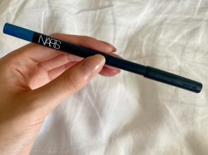 3.鮮やかブルーペンシルアイライナーを使い、ラインを入れます。まつげの下からペン先を当て、中央→目尻、中央→目頭の順番にまつげの隙間を埋めるように描いていきます。