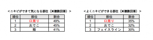 ニキビができて気になる部位の第一位は「口周り」で49%でした。また、よくニキビができる部位の第一位も「口周り」で35%という結果に。口周りは、一番ニキビができて気になる部位であり、かつ、よくできる部位ということが判明しました!