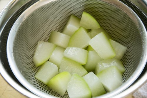 2/冬瓜は、ピーラーなどで皮を剥き、大きめに切って湯から10分茹でる。その後氷水にあけ、水気を切っておく。