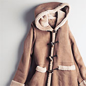 続いてページ下の写真。ショートダッフルこそ、大人にとっての最難関ですが、フードにファーがあしらわれているだけでまったく印象が変わるのですね。モノトーンのコントラストで全身色み抑えめっていうのもカギです。足元はボルドーのオペラシューズ! 素敵です!