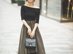 赤ニットと今年流行のフレアスカートの、上品でクラシカルなスタイリング。グレーのロングマフラーを取り入れると、さらに遊び心もプラスできます。
