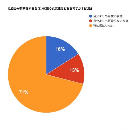 男性の場合も「特に気にしない」派が圧倒的に多い結果に。次いで、「自分よりもかっこいい友達」派の21%でした。男女とも、合コンに誘う友達は、可愛い&かっこいいをあまり気にせずに誘っているみたいですね。