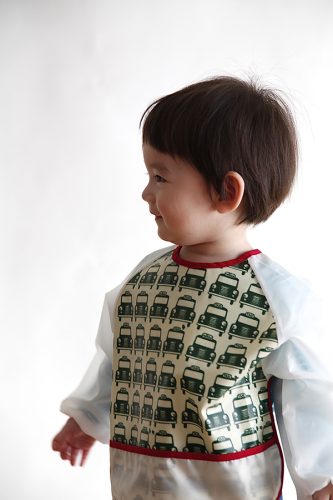 プリント部分はラミネート加工してあり、袖はポリエステル地だから汚れてもさっと拭けばOKなエプロンは、お手入れがラクで大人気のアイテム。