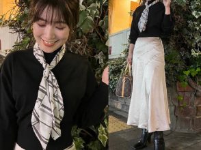 [左中]スカート以外はALL黒で、色のかわいさをとことん引き立たせて。チェック柄ストールで視線を上に集めつつ、頭から足先まで、締め色の黒で縦ラインをつくれば、ついでにスタイルUP効果だって狙えちゃいます♡