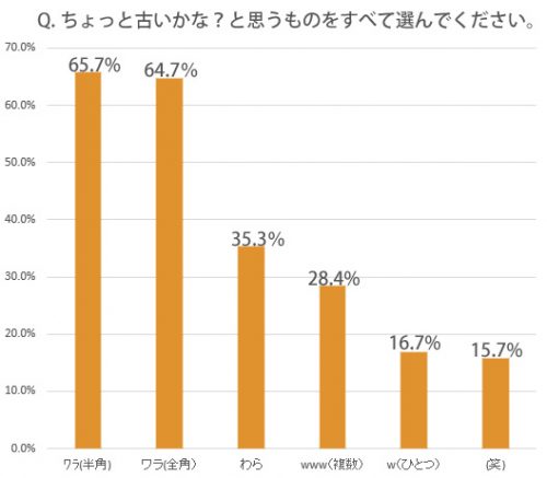 ちょっと前は、ネットスラングから発生し、そこからむしろ若い世代が使っていた印象がある「ワラ」「ワラ」あたりが圧倒的に「古い」という感想に。