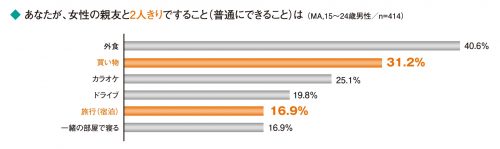 一緒に食事するだけでなく、買い物、カラオケ、ドライブなどデートでするような行動を友達として行う男子、こんなに多いのですね。街中や観光地で、若い男女が2人仲良く過ごしているのを見かけても、カップルではなく良い友達という可能性は意外にも高いようです。