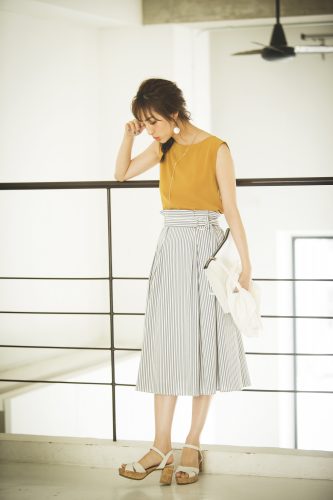 ストライプが縦長効果を強調するうえに、ウエストベルトで自然にスタイルアップが叶うアイテムです。
