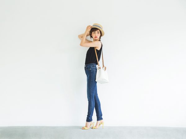 足元はイエローのサンダルを合わせて、季節感もしっかりとプラス。