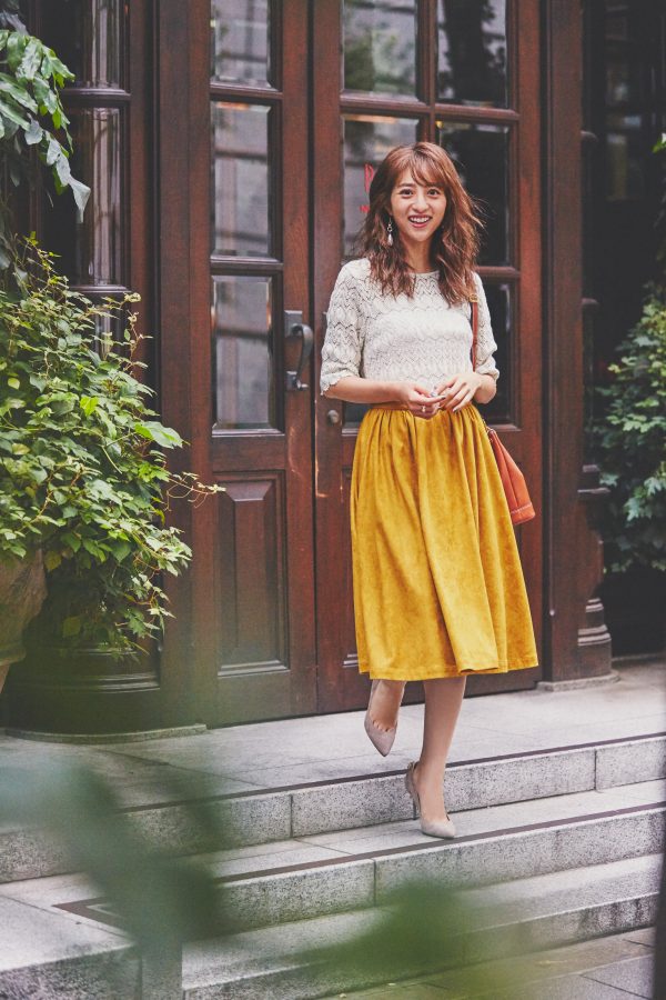 ■上品なスウェード素材のイエロースカートが主役のレディスタイル