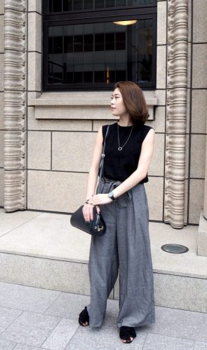 大人っぽく着こなしたかったので、黒のパンツを合わせたモノトーンスタイルでまとめました。