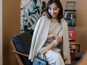インをライトグレーのワントーンでまとめたスタイルは、ONにもぴったりなきちんと感と女性らしさを両立。アウターの柔らかい素材感とインの淡い色合わせが、優しげな雰囲気を醸し出します。