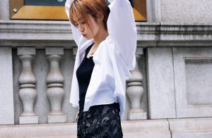存在感のある赤も、透け感のあるシアー素材なら挑戦しやすい! インナーのキャミは馴染ませるのではなく、濃いめカラーで「あえて透けさせる」のが色気を高める秘訣。スカートはライトグレーで清楚に。外出時の羽織りはトレンチなどレディな軽アウターがおすすめです。