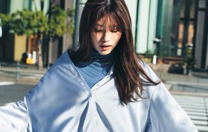 光沢のあるサテンシャツは、あれこれデコらずシンプルに着こなすのが洒落見えの近道。色味をそろえた清潔感のあるブルーワントーンで、派手じゃないのに目を引く女っぽスタイルがつくれます。ドレスライクな素材感を着くずすイメージで、ボタンは全部留めず襟を抜いて着るとさらにこなれたムードに。