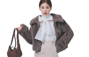 スリット上のジップとフロントに寄せられたタックが、タイトスカートのさりげないアクセントに。トップスは最旬のボウタイブラウス、さらにリッチな印象のファーブルゾンをはおったトリプル映えコーデで、ドラマティックに仕上げて。