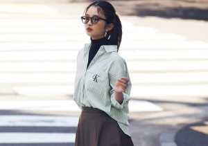着こなしにエッジをもたらすレザー調スカートは、ハンサム見えの即戦力! ブラウンと好相性なグリーンのストライプシャツを合わせて、目を引くチョコミント配色に。シャツの下にはタートルを仕込んで、防寒と奥行きを両立。