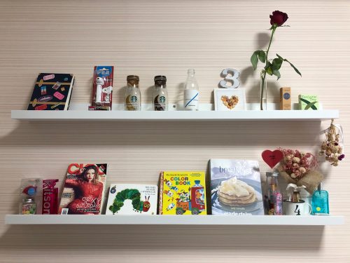 私のマンションは壁に穴を開けてもよかったので、白い棚をくっつけています。
