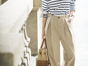 マリンなボーダープルオーバーとタック入りのワイドチノパンツのコーディネート。