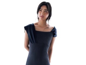 ニット素材のクラッチバッグを合わせれば、より季節感のある着こなしに。