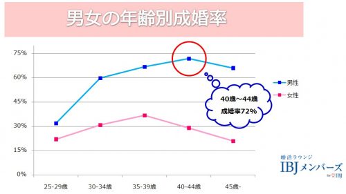 男性は「40歳~44歳」がピークに。モテ期の「35歳~39歳」の間に、結婚するのではなく、その間に吟味して40代で結婚へ踏み切るよう。