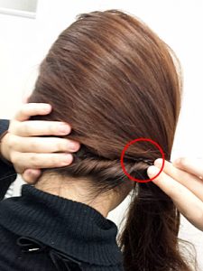 【2】襟足の髪を適量取り、前髪の分け目があるほうから逆方向に向かって、ねじりながら寄せていく