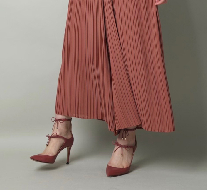 細かなプリーツが軽やかに揺れるシルエットがきれいで、ハイウエストなので脚長効果も抜群! 透け感があってふんわり軽やかなシフォン素材が春らしい一枚です。