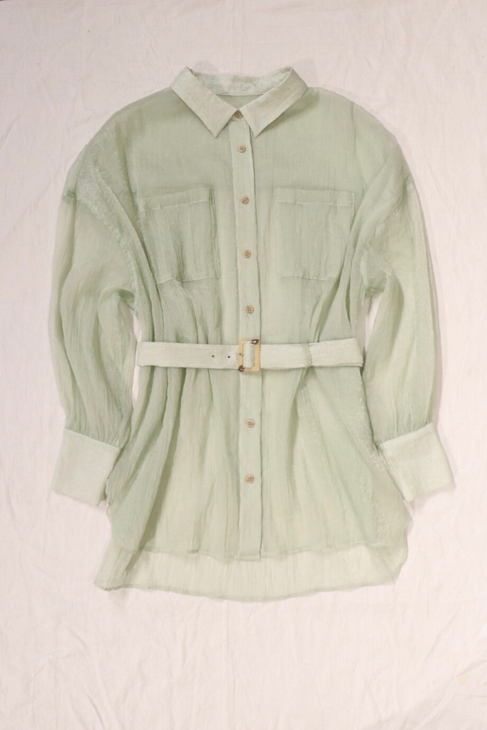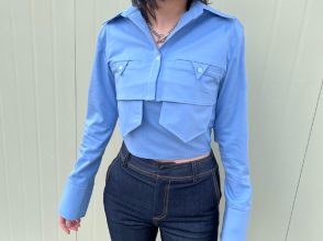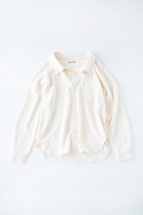 程よい華やかさとインパクトを両立させる、フェミニンな印象のシャツ。第一ボタンまできちんと留めて着たい。通勤ではおるなら、白シャツがほんのり透けるぐらいの薄手のクルーニットをプラス。