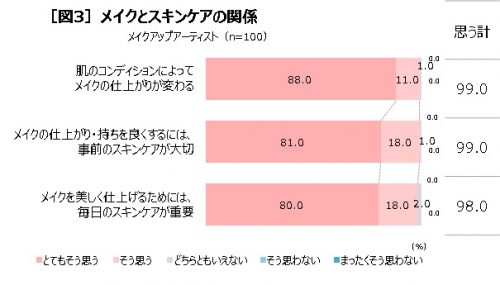 メイクとスキンケアの関係について聞くと、ほぼ全員が「肌のコンディションによってメイクの仕上がりが変わる」(99.0%)と答えています。