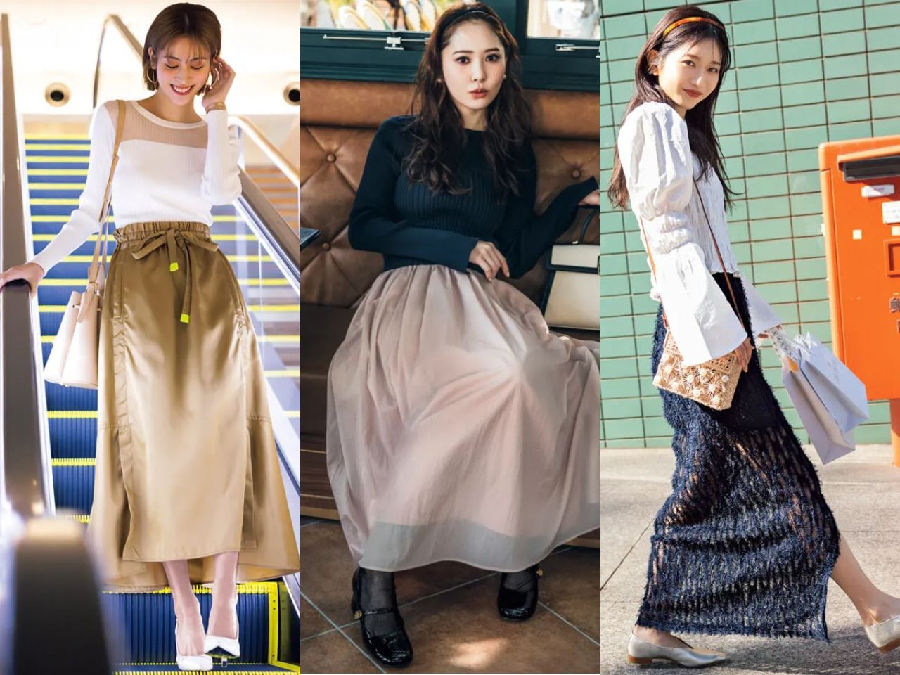 この春は軽やかなチュールやフェミニンなサテンなど、旬な生地で着慣れたロングスカートを春モードにアップデートするのがおすすめ♡ ロングスカートはタイトめなトップスを合わせるとスタイルがよく見えますが、今季はオーバーサイズシャツなどゆるシルエットのトップスを選ぶのもこなれ見えのポイントです。