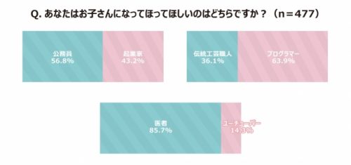 「公務員VS起業家」では、男の子女の子ともに「公務員」に軍配が挙がっているものの6:4程度で、失敗する可能性もあるけれども一獲千金も夢じゃない「起業家」への挑戦心を持ってほしいというママたちの期待が垣間見れました。