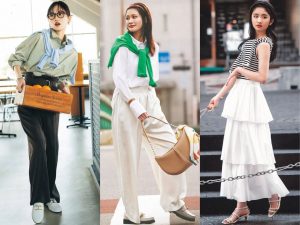 ベーシックなワイドパンツにシアーワンピをスカート感覚でレイヤリングすれば、足元だけを切り取っても高感度な上級者顔に。質感のある白カーデや小物まで好印象な白でまとめるのが着こなしやすさの秘密。