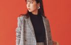 スリット入りの着流し風コートをラフにはおって、感度高めのハンサムフェミニンStyleに。コートの下は黒ニット×ネイビースカートでシックにきめて、ブラウン系のチェックコートをおしゃれっぽく引き立てて。