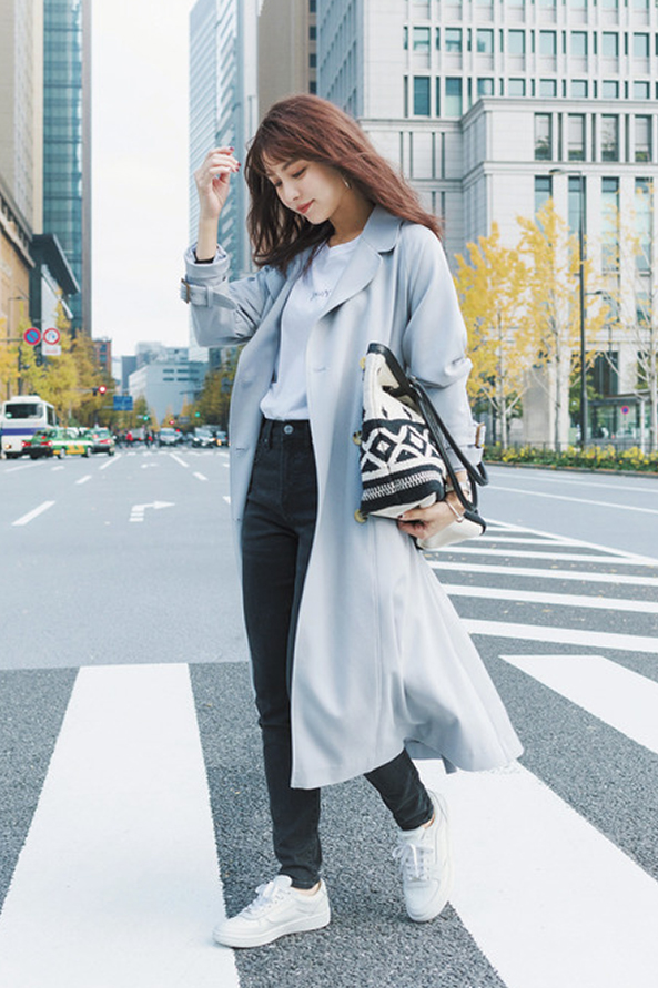 バサッとはおれるメンズっぽいトレンチは、やわらかなピンク色でフェミニンに引き寄せて。インナーを白のメッセージTシャツや黒スキニーでメンズっぽく仕上げると、全体のバランスがまとまります。靴はピンクやブラックと相性のいいグレーのコンバースがおすすめ。