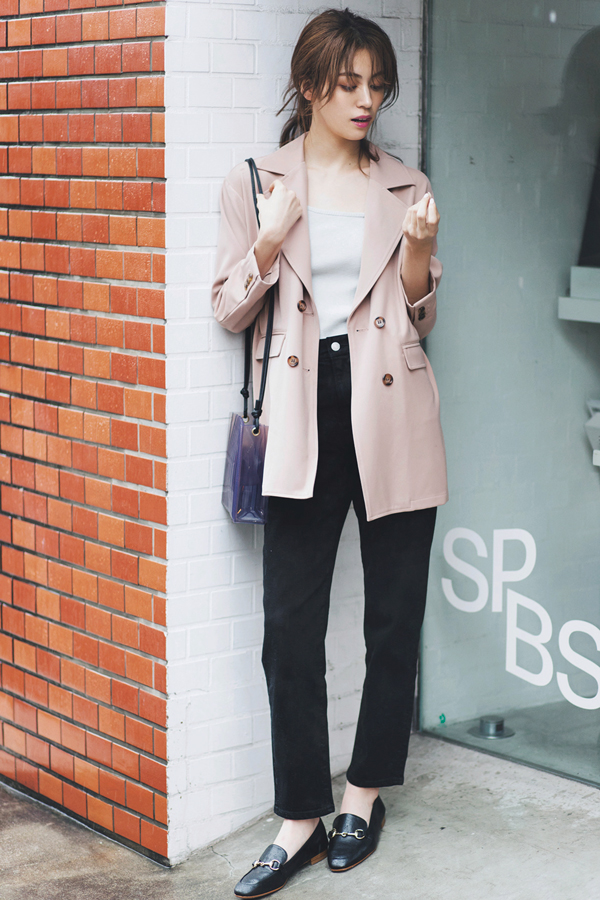 【1】黒パンツ×ベージュジャケット×白インナー×黒ローファー